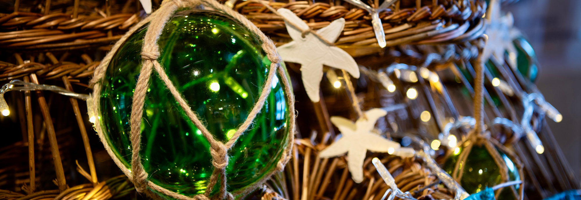 A festive Christmas Tree made of willow lobsters, with glass buoy decorations and twinkling lights.