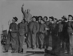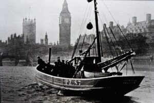 Meanwhile the Rosebud and her crew continued steadily along the Channel coast. After a brief stop at Dover to pick up Thames charts and followed by a temporary grounding on leaving Dover harbour they began to head for the mouth of the Thames with most of the crew on deck all night following the unfamiliar course. They entered the Thames in the dawn of Thursday and began the haul to London. Their passage was marked all the way by other vessels, by dockers and rivermen and as they neared their destination the banks of the river were lined with waving and cheering members of the public the crew were amazed at the size of the reception and waved and raised their fists in acknowledgement. Just after 11 o’clock Rosebud was led to Westminster Pier by a police launch and followed by a river launch hired by the press and full of cameramen.
