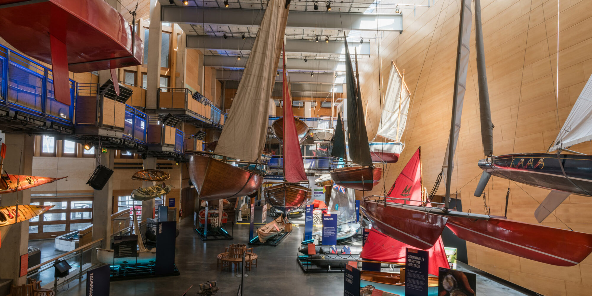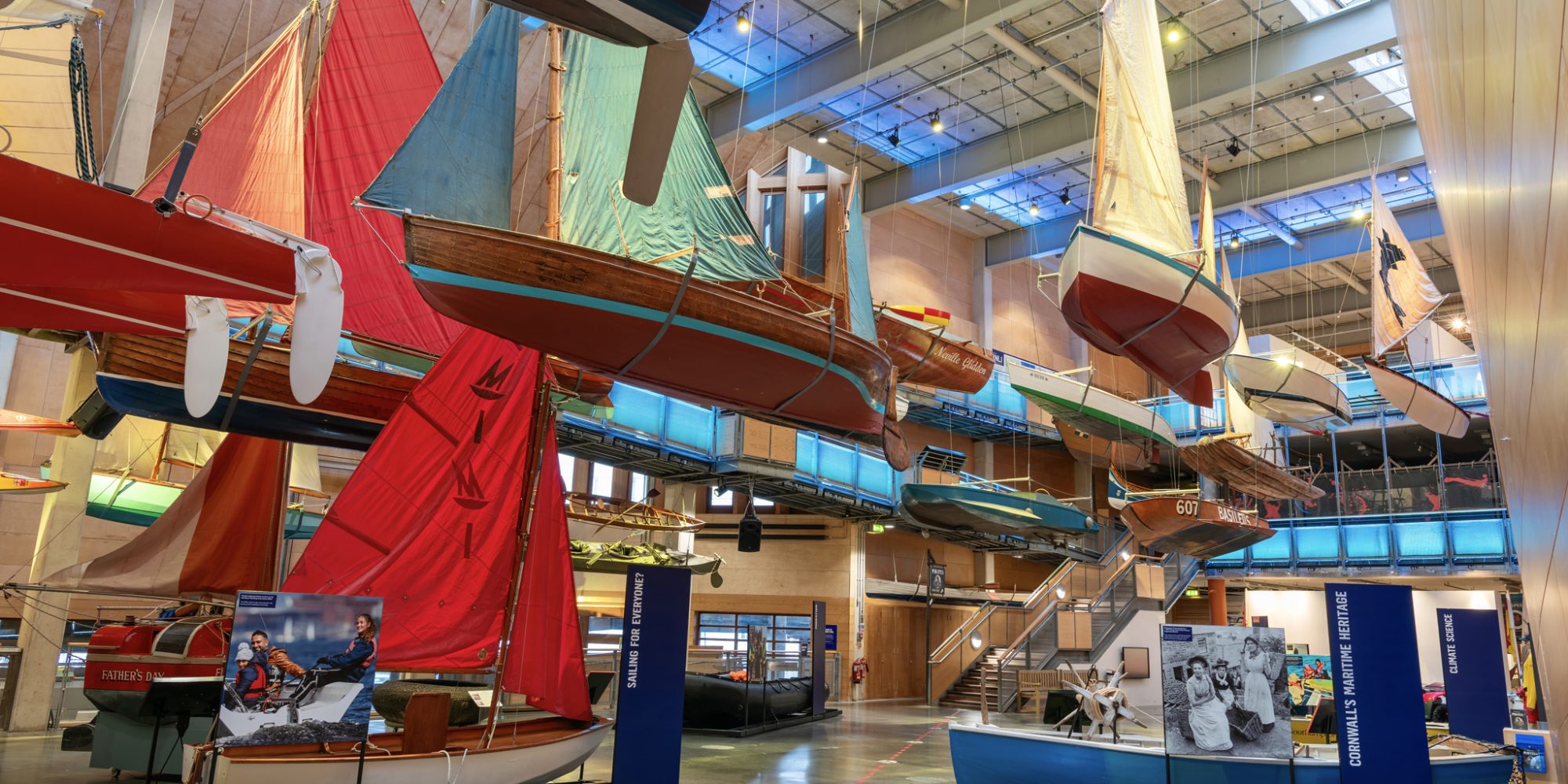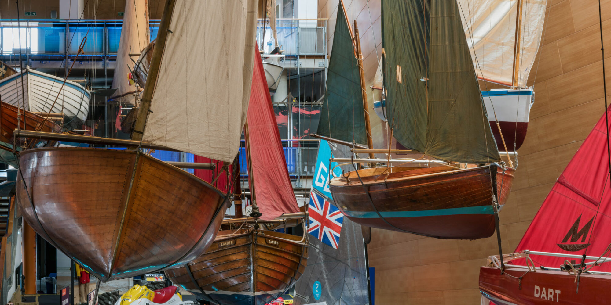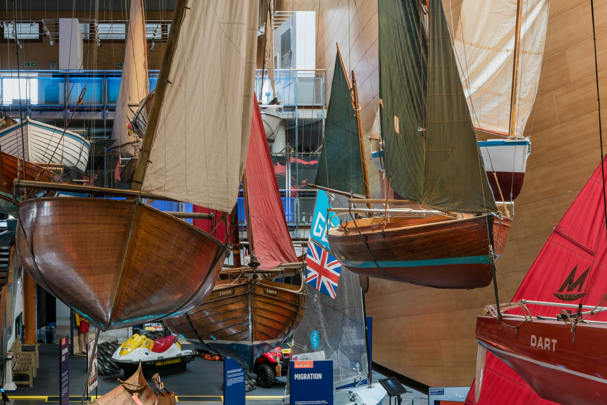 Flying across the top of the Boat Hall is our flotilla of small boats from The National Small Boat collection. Preserving a collection of international importance, including craft used for survival, work, competition, leisure, pleasure, exploration and war… from the Inuit kayak, a deadly hunter’s tool of skin and driftwood with an unbroken pedigree stretching back 10,000 years to the Mirror dinghy, as much a part of the ’60s social revolution as the Mini car. The museum doesn’t just tell the story of inanimate objects – it relates the tales of the lives and the times of those who made and used them.